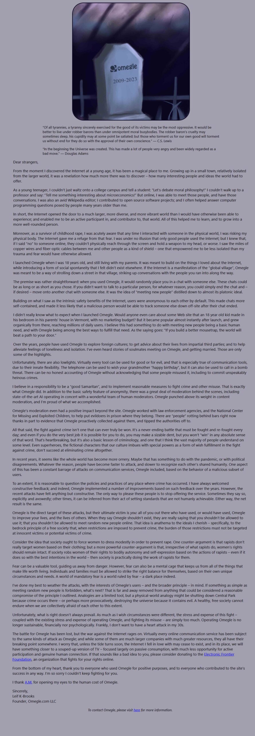 From the bottom of my heart, thank you to everyone who used Omegle for positive purposes, and to everyone who contributed to the site’s success in any way. I’m so sorry I couldn’t keep fighting for you.